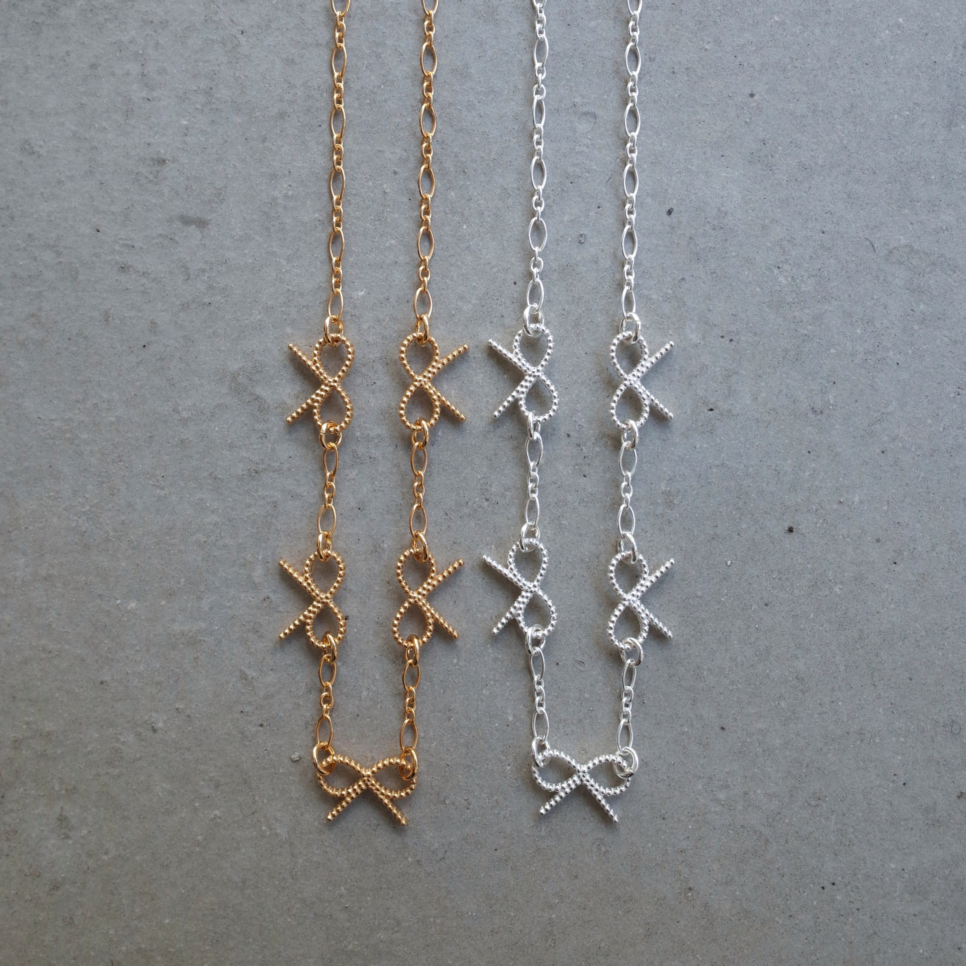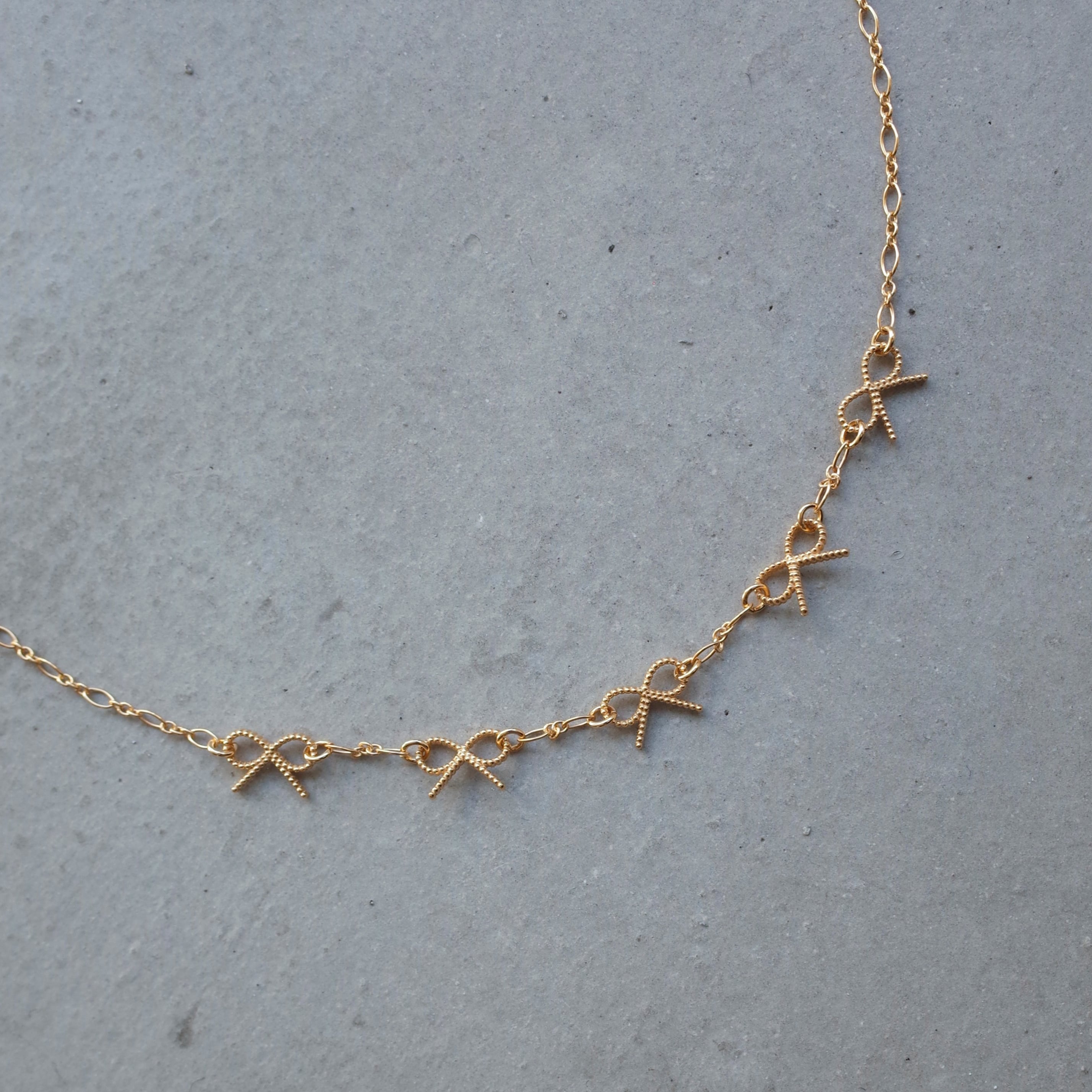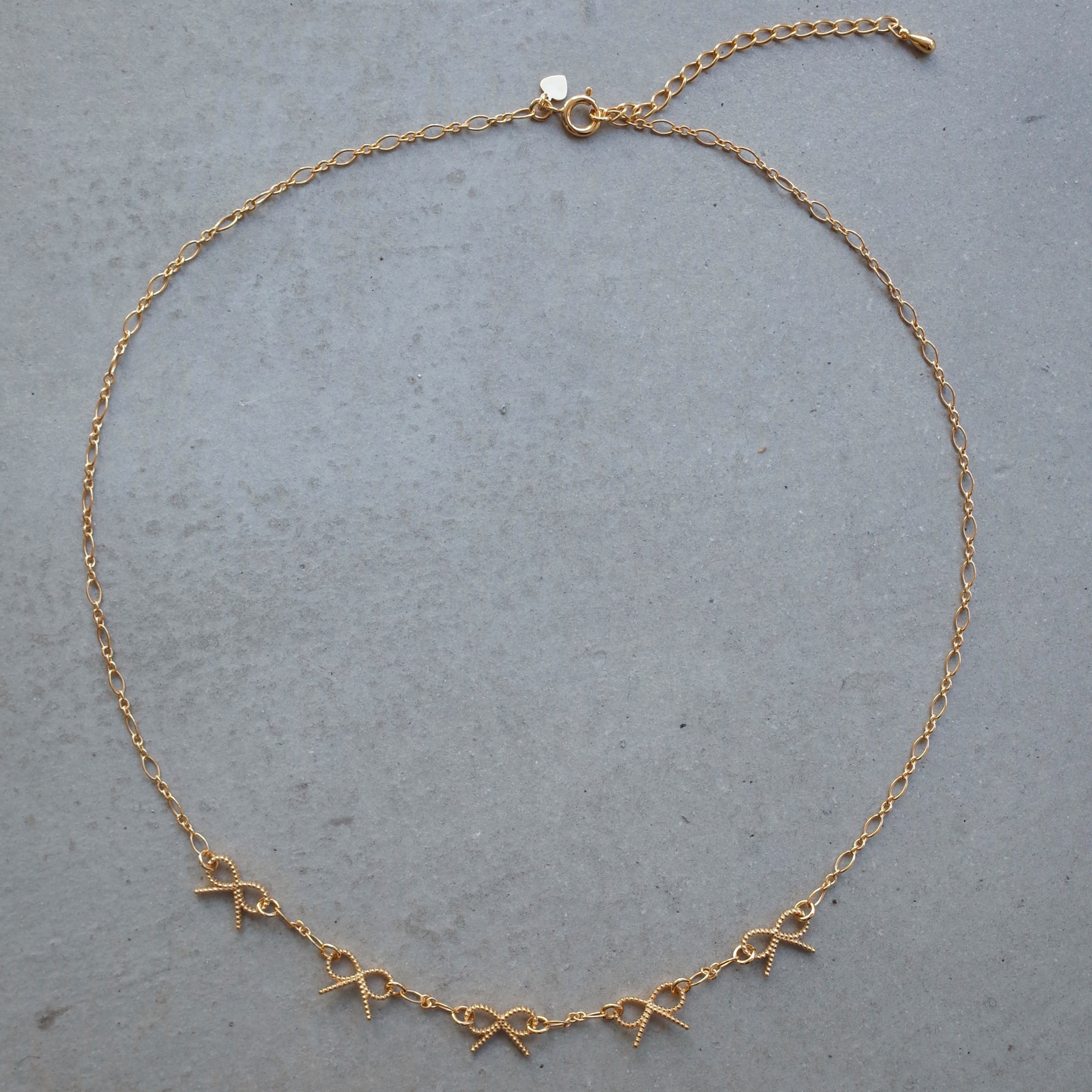 A delicate necklace featuring a series of tiny ribbon motifs.