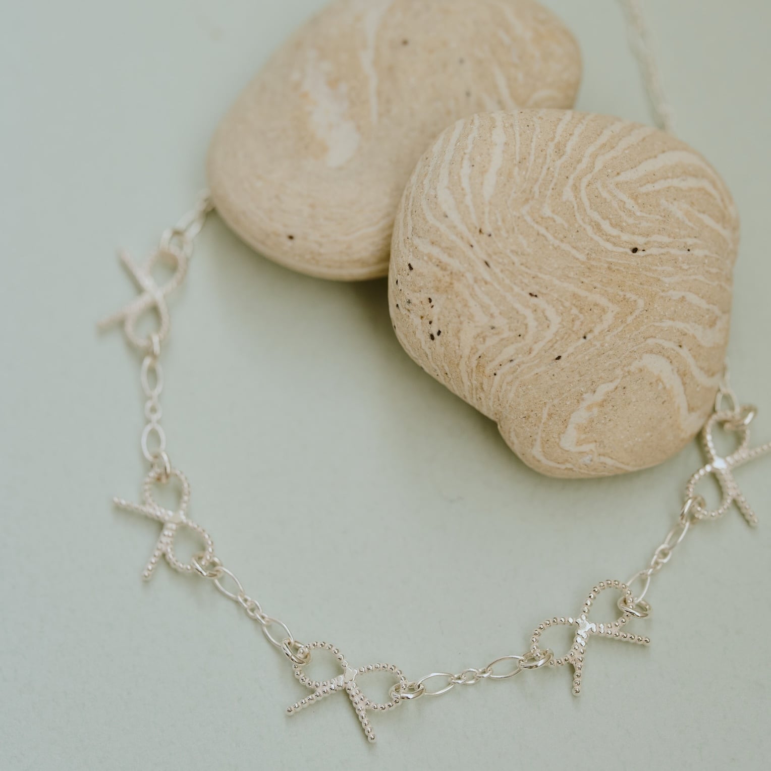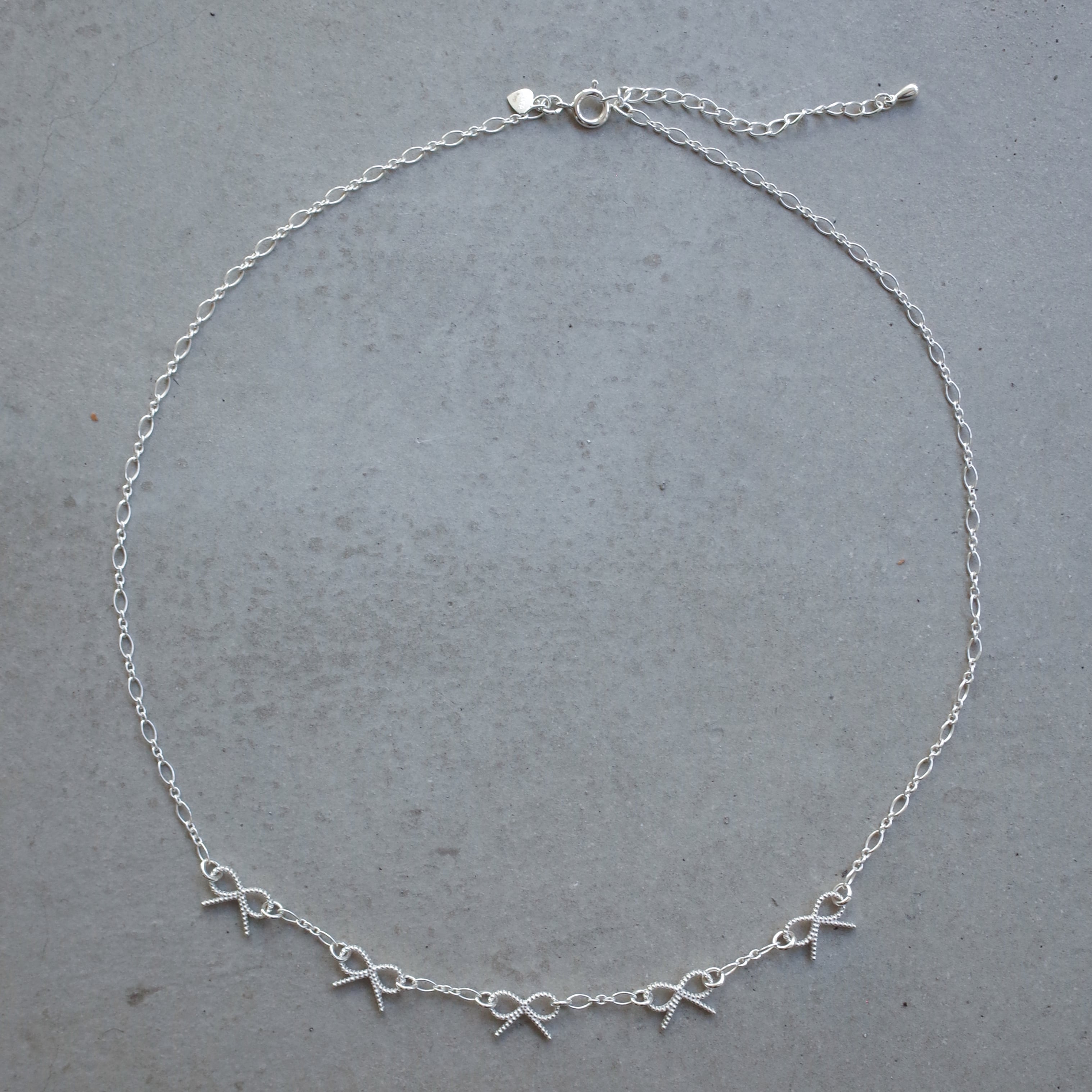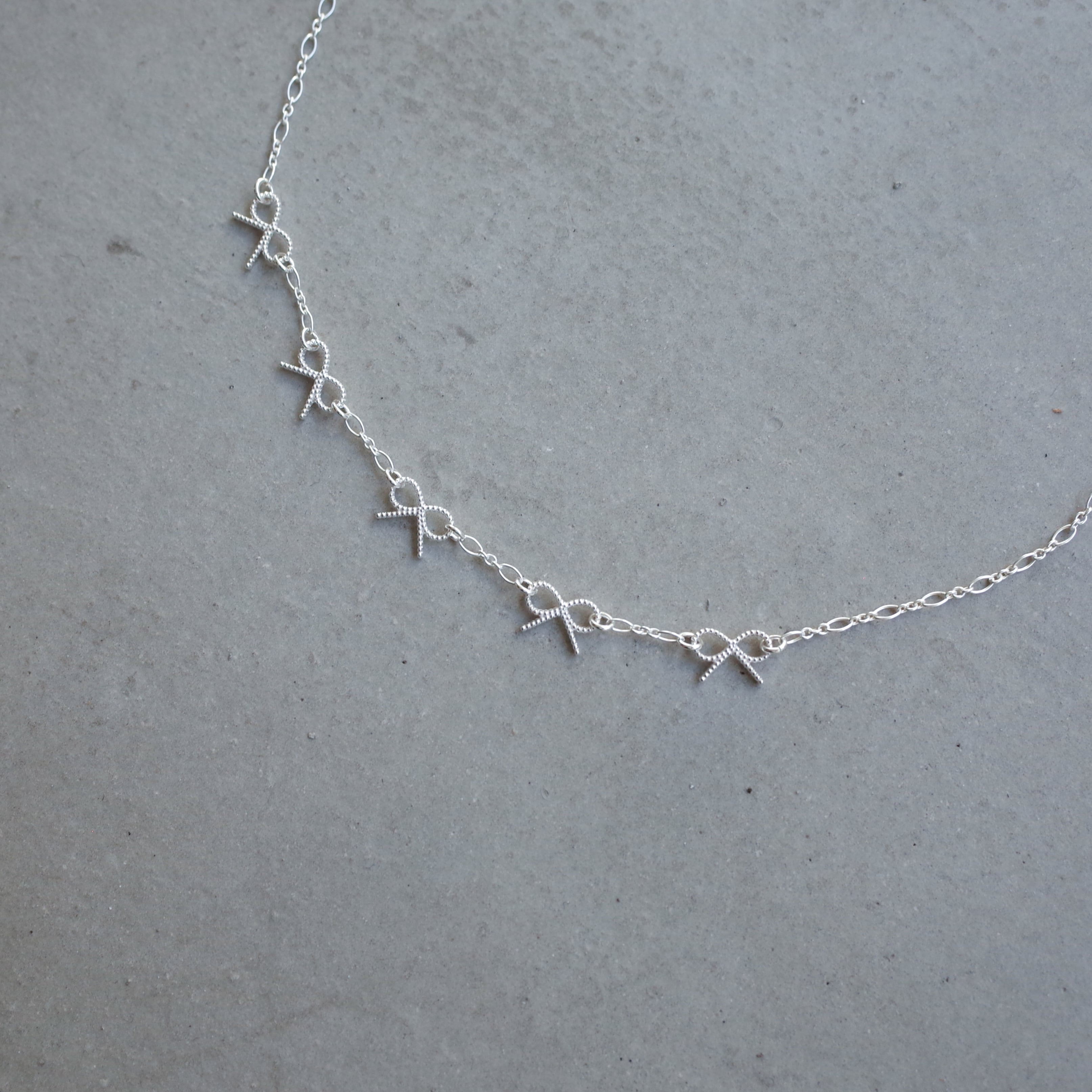 A delicate necklace featuring a series of tiny ribbon motifs.