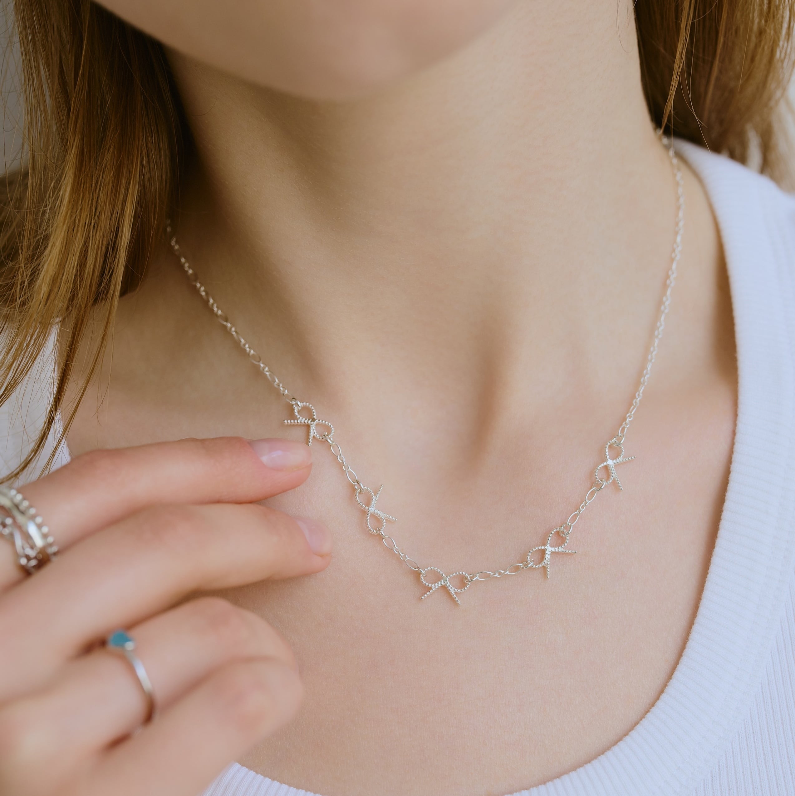 小さなリボンモチーフがさりげなく並ぶ、繊細なネックレス。