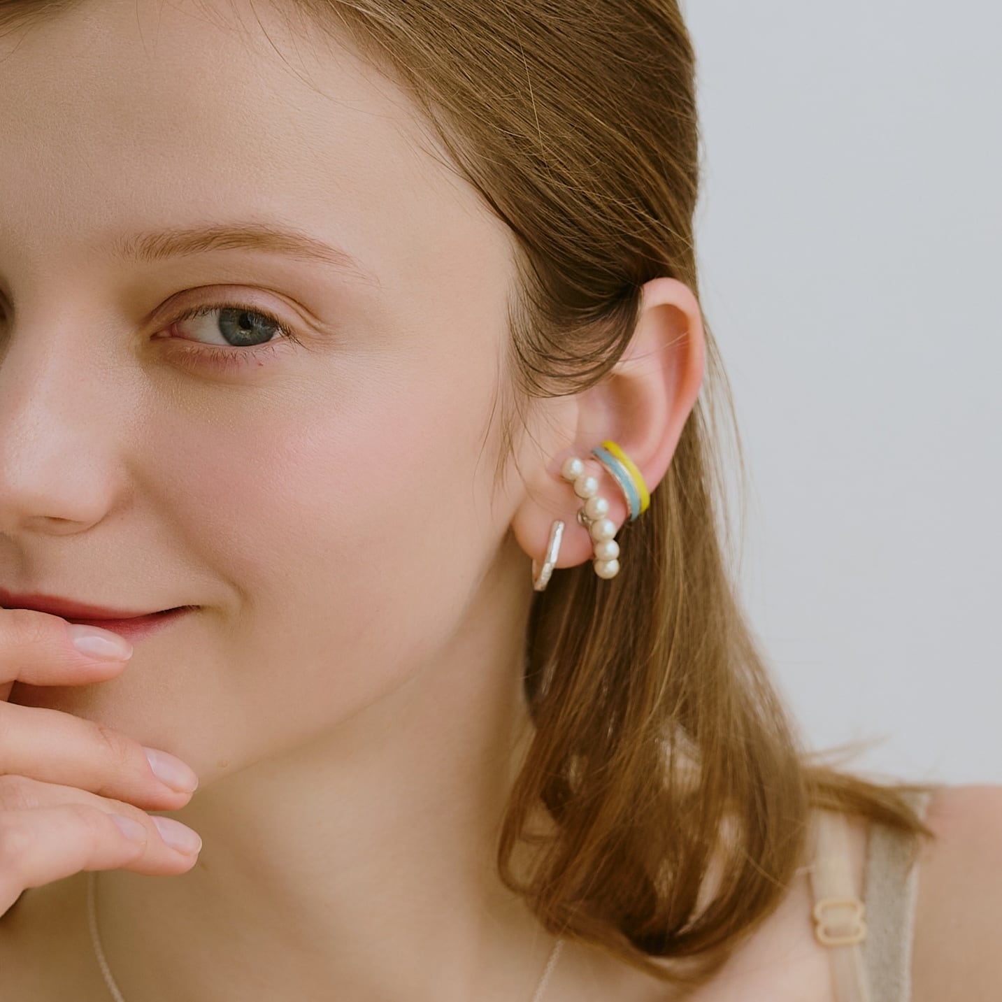 シンプルながらも直線的すぎないラインが、耳元に自然な抜け感をプラス。
