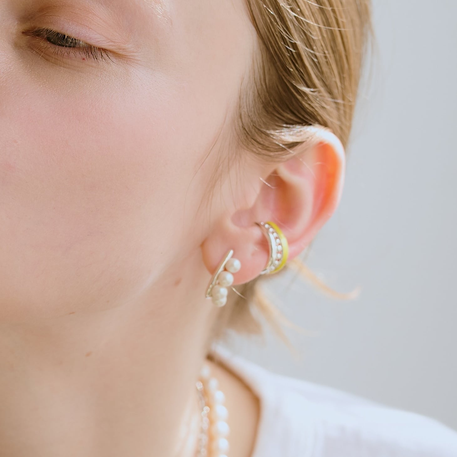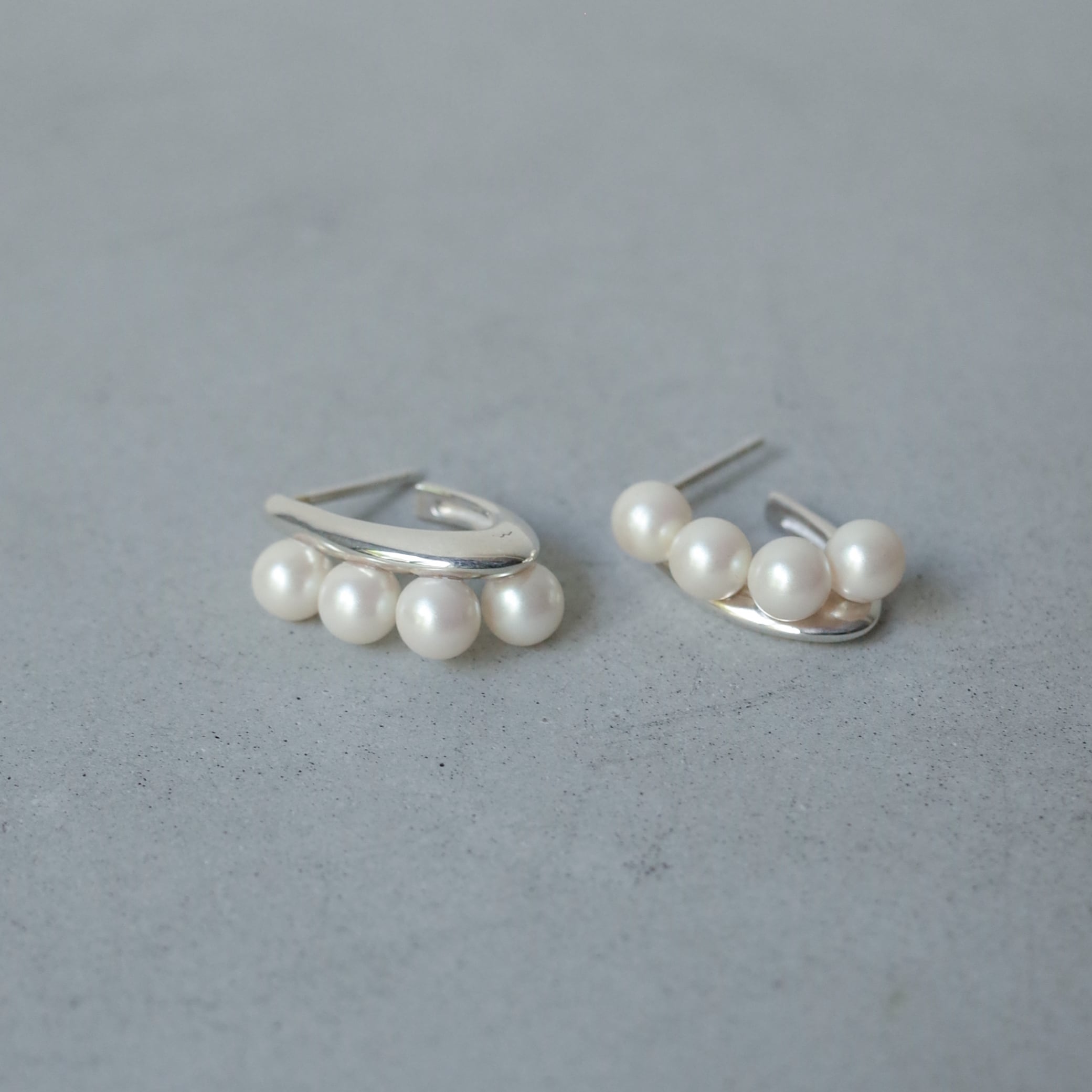 やわらかな艶をたたえた淡水パールを並べ、シルバーのラインで包み込むように仕立てたピアス。